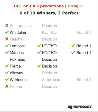 UFC/MMA UFC on FX 6: Sotiropoulos vs Pearson Quick Predictions Posted by KDog13 on December 14, 2012December 14, 2012 Share this: Click to share on Facebook (Opens in new window) Facebook Click to share on X (Opens in new window) X Like Loading... Related